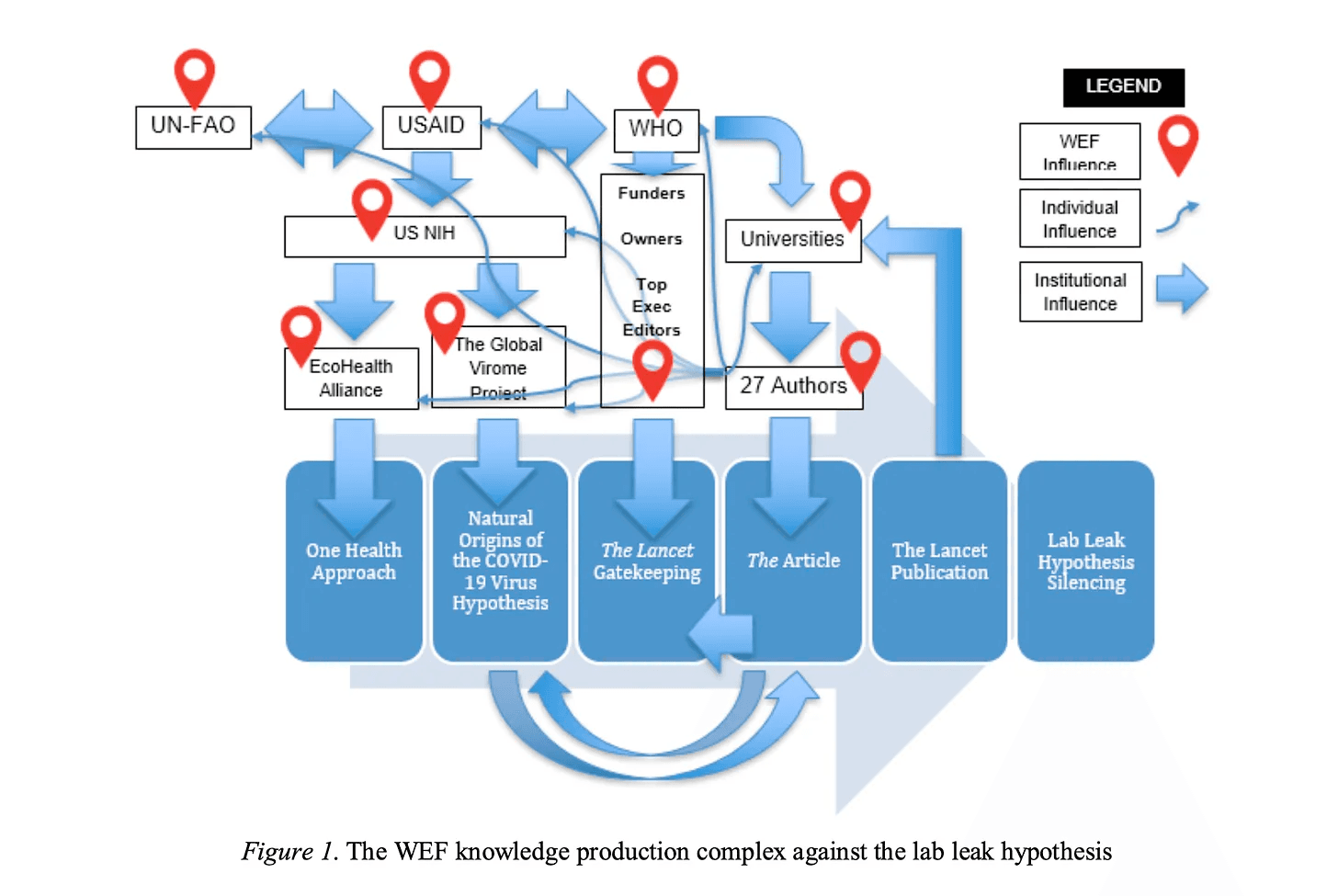 The data show that the WEF is part of the micro and macro environments that shape editorial gatekeeping. There is a playing field biased towards their system and only ideas that promote their system will have a chance to be heard. That the lab-leak hypothesis is silenced is what the article of the 27 authors may have likely aimed to ensure. Figure 1 below shows the network supporting the natural origins hypothesis of COVID-19.